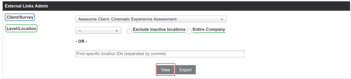 The links can be created for the Entire Company, you can select the level/location from the dropdown, or manually enter specific location IDs. Hit the View button to view the links.