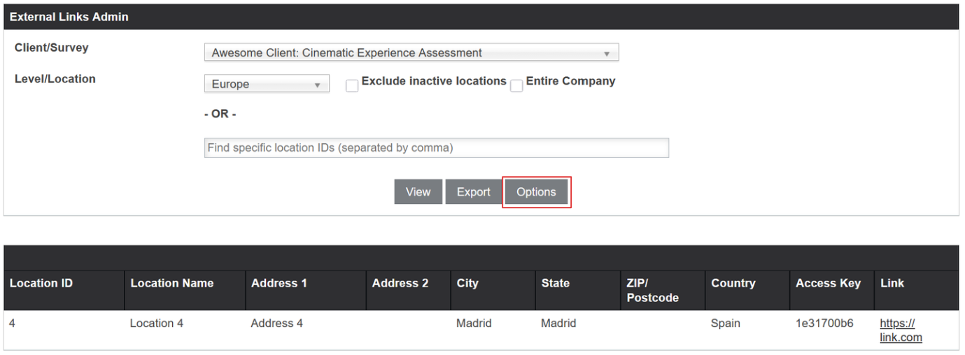The page will update with a list of locations for which the links will be generated, alongside an Options button.