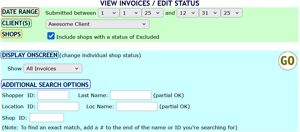 The Additional Search Options section, on the other hand, ensures you can edit, or list, a selected handful of invoices that exactly match the filters you want to use.