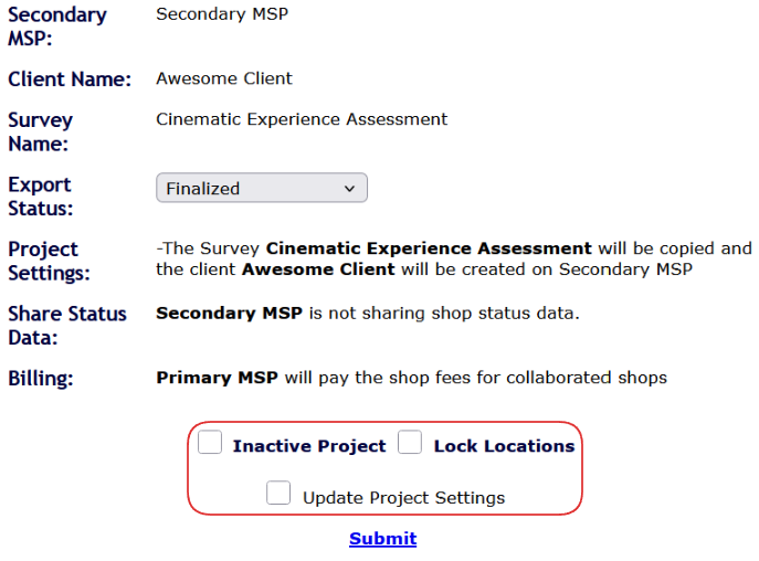 For surveys and shops to function correctly, all locations must be shared with the Secondary MSP as part of the collaboration setup. In most cases, you will also want to select Lock Locations on secondary, disallowing the Secondary MSP to make changes to the locations on their system.