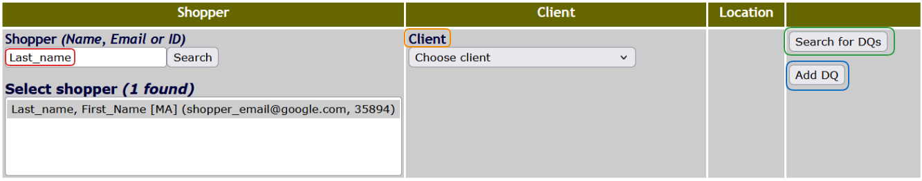 Once you select a shopper, you can search for their disqualifications, add a new one, and filter by client you want to add a disqualification for, or list by.