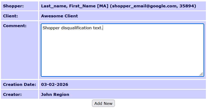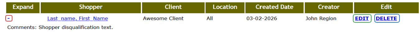 To see the comment text, use the plus or minus button in the Expand column. The page also allows you to edit, or simply delete the disqualification from the shopper.