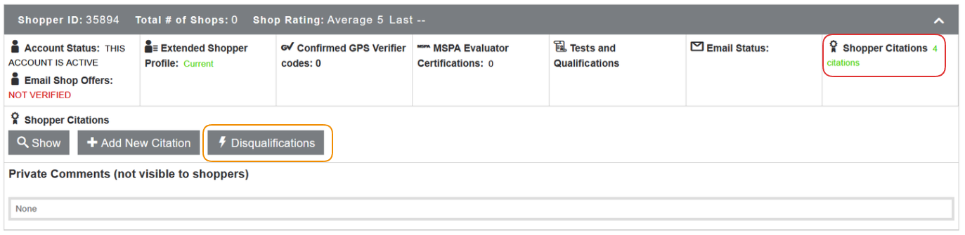 Using the Disqualifications button in the Shopper Citations section on the Shop Log page will also open the Shopper Disqualification admin page, listing the disqualifications added to the shopper.