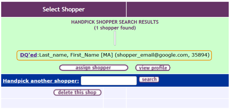 On the Shopper Disqualification main page enter the shopper's last name, their email or their ID and use the Search button.