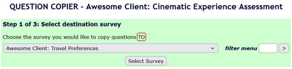 Step one of the process is to select the survey you want to copy the questions to.