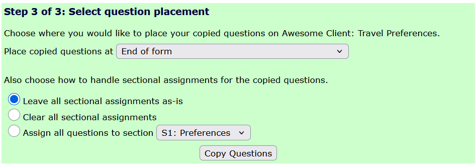 Additionally, you can assign the new questions to a section of the new survey, clear the sectional assignment, or leave the section assignments as is.