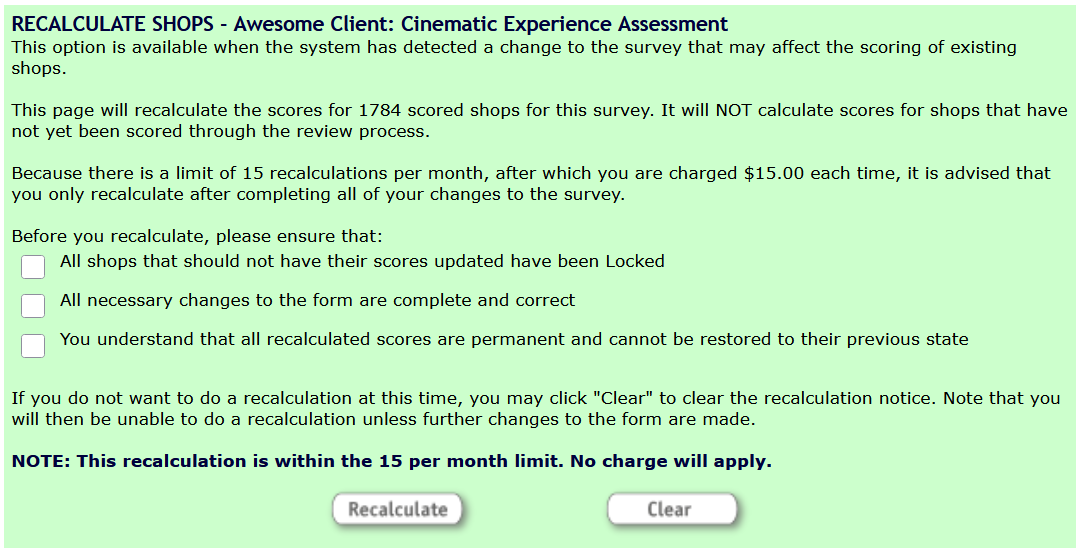 Before you use the Recalculate button, please ensure that all changes to the form are complete and correct, and that all shops that should not have their scores updated have been put into the Locked status.